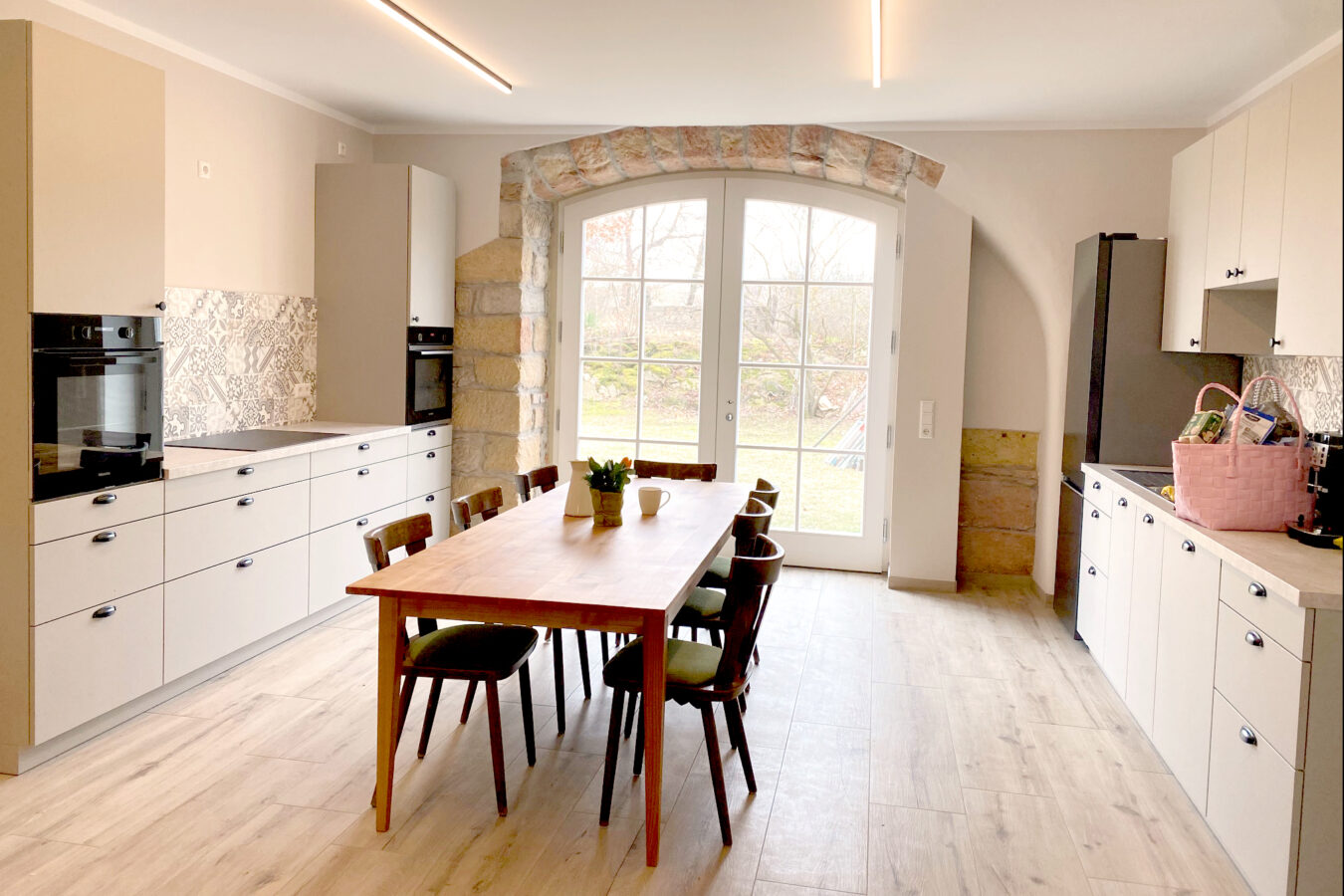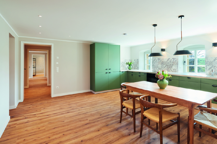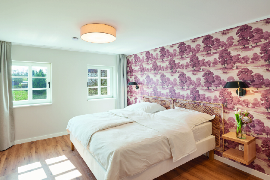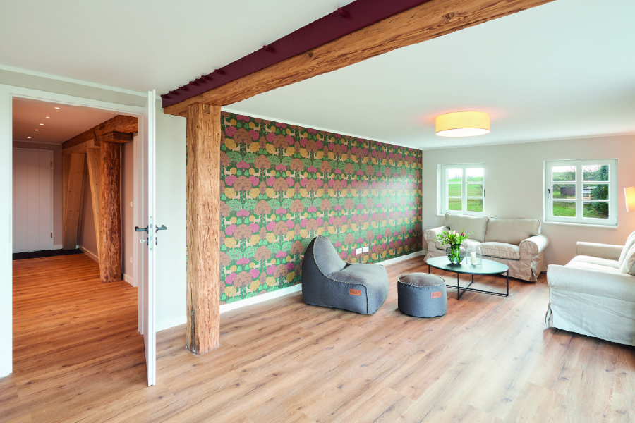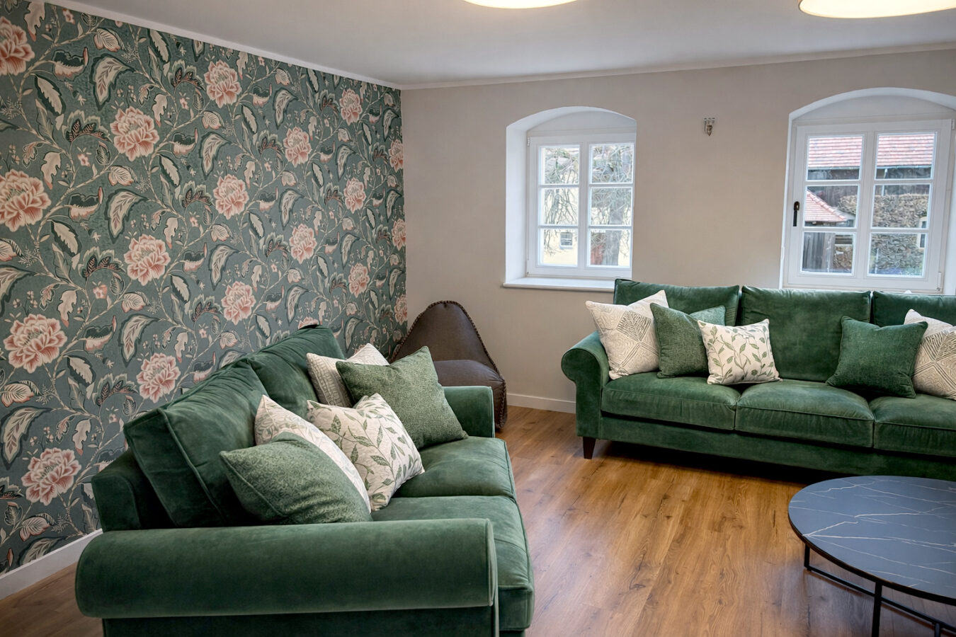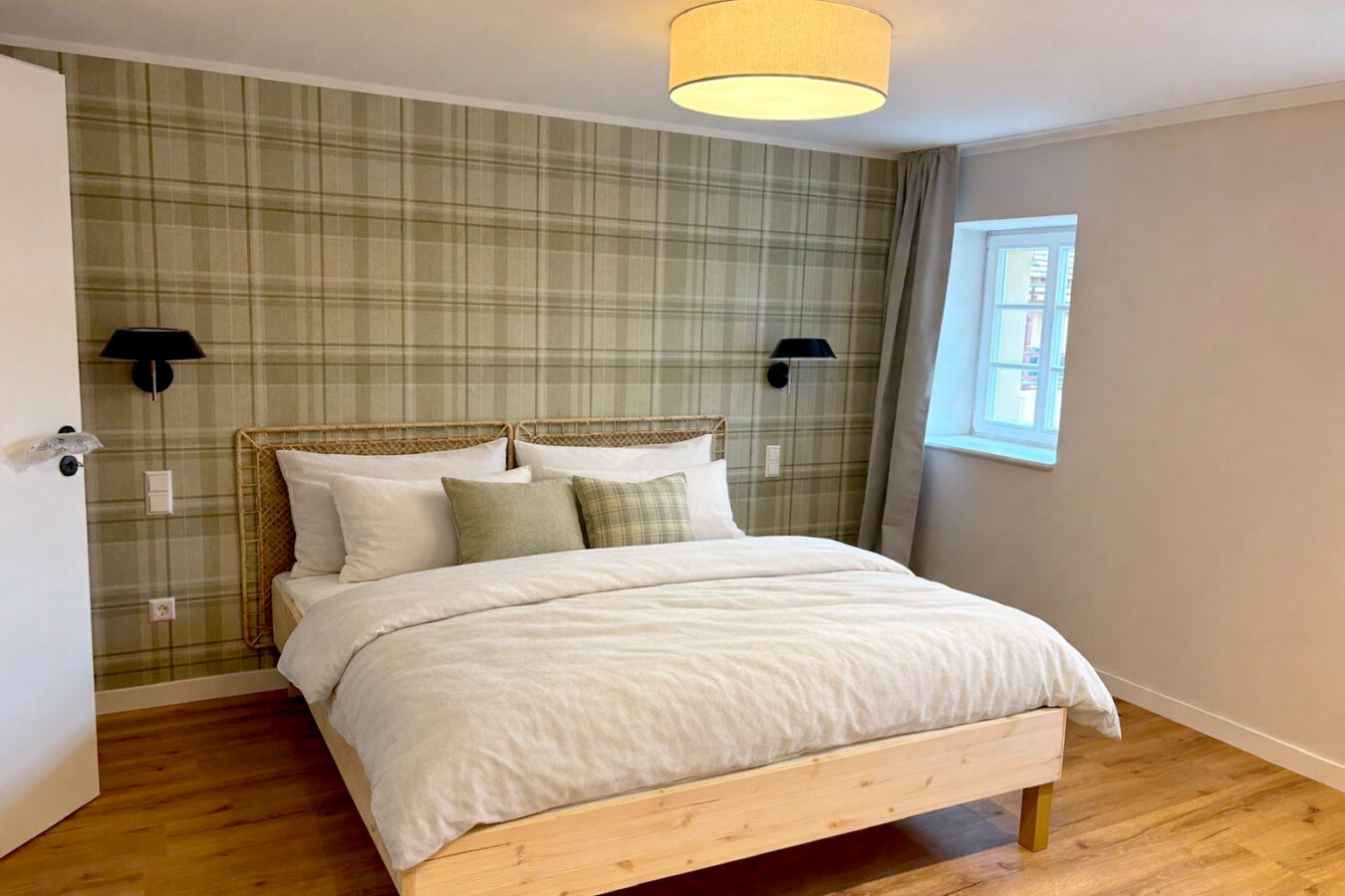 Im Obergeschoss entstehen zwei exklusive Ferienwohnungen, die den Charme der alten Bausubstanz mit zeitgemäßem Komfort verbinden. Die Sanierung erfolgt besonders nachhaltig: Die gesamte Anlage wird zu 100 % über Fußbodenheizung beheizt, gespeist durch Holzhackschnitzel aus unserem gutseigenen Wald.